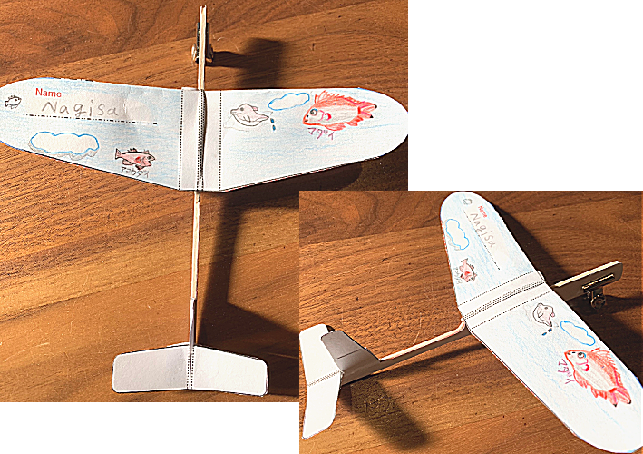 その2、いただきましたバルサ飛行機を、早速、子どもと作り、飛ばしてみました。よく飛び、びっくりしました。子供にとって、重心の位置や、翼の角度を少し変えるだけで、飛び方が変わるのがおもしろかったらしく、試行錯誤を繰り返していました。ありがとうございました。