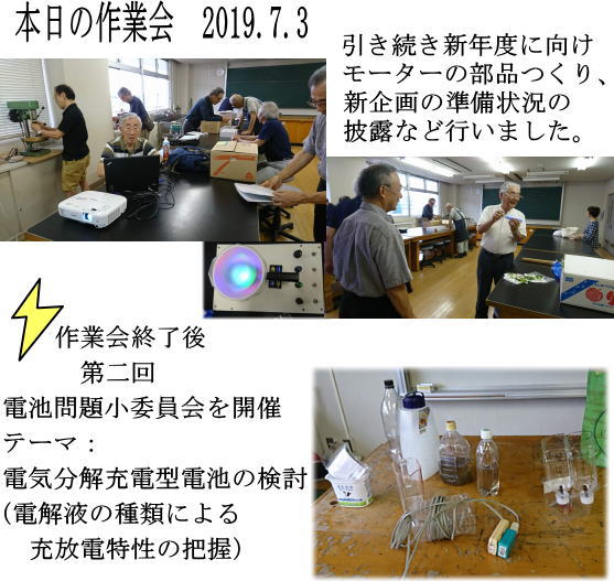★★ 第五回電池問題小委員会が開催されました。本日は木炭充電電池の特徴を条件を変えていくつかの場合に対して実験により、テストをしました。その様子の一部です。2019.9.4