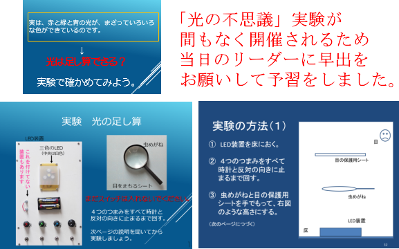 今日も盛り沢山の内容でした。まじかにひかえた「光の不思議」pptの見直しにY字振り子実験の進め方・内容、残り少なくなった今年度分最後のモーター部品袋詰めなどでした。動画もあわせてご覧下さい。
