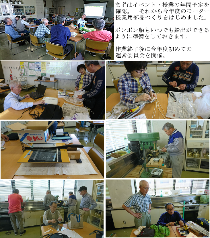 今年最初の作業会に、協力会員の方達2名も入れて、合計15名の参加だった。大勢での作業、ほぼ1時間半で、来月前半の出前授業に使うモーターキット300台分の段ボール詰めを完了した。